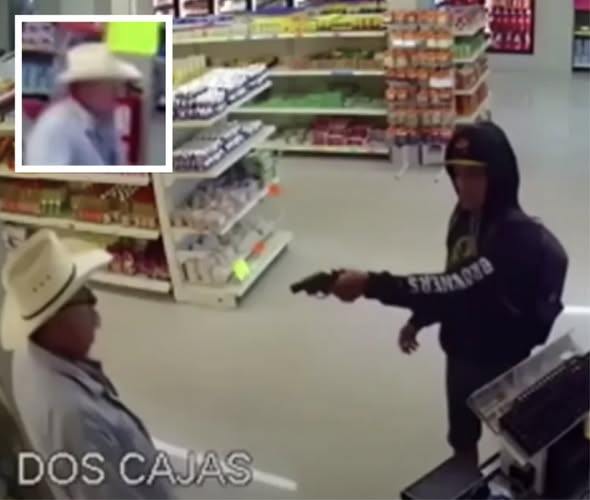 The gunman then points his gun at the man standing in front of the counter, who has a gray mustache and a cowboy hat. He seems even calmer than the cashier, as he shakes his head after the gunman talks to him, before pulling off his glasses.
