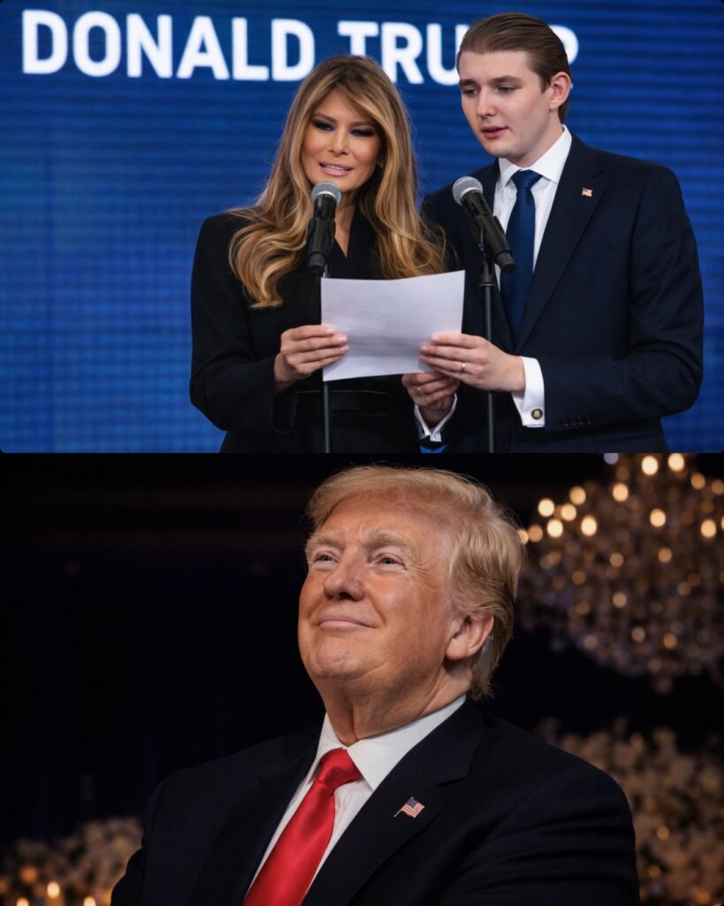 Barron Trump was the first to walk onto the stage. Now a young adult, no longer the quiet child once seen standing behind his parents during White House appearances, he moved calmly and deliberately. Minutes later, Melania Trump joined him. Dressed simply and elegantly, she did not wave dramatically or approach a podium. She nodded to the crowd and stood quietly beside her son.