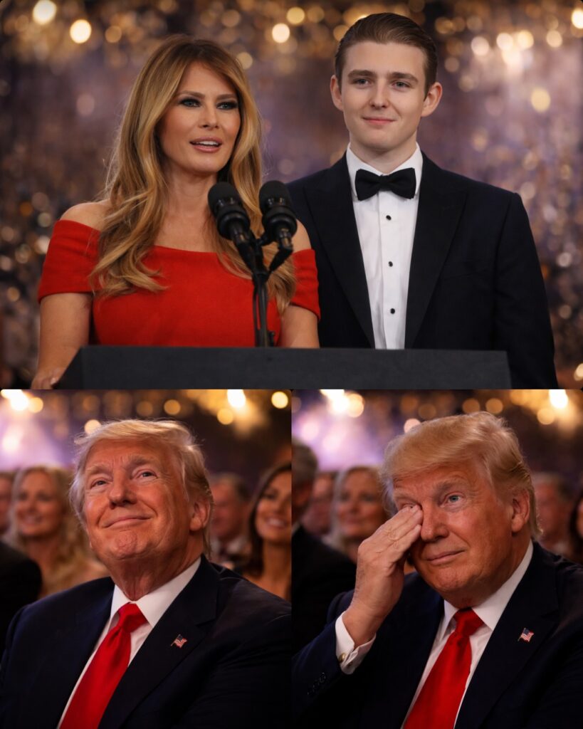 Out of the shadows stepped Melania Trump, wearing a striking red gown that immediately drew the attention of everyone in the room. Walking quietly beside her was Barron Trump, the youngest member of the family, now much taller than many guests remembered from earlier public appearances.