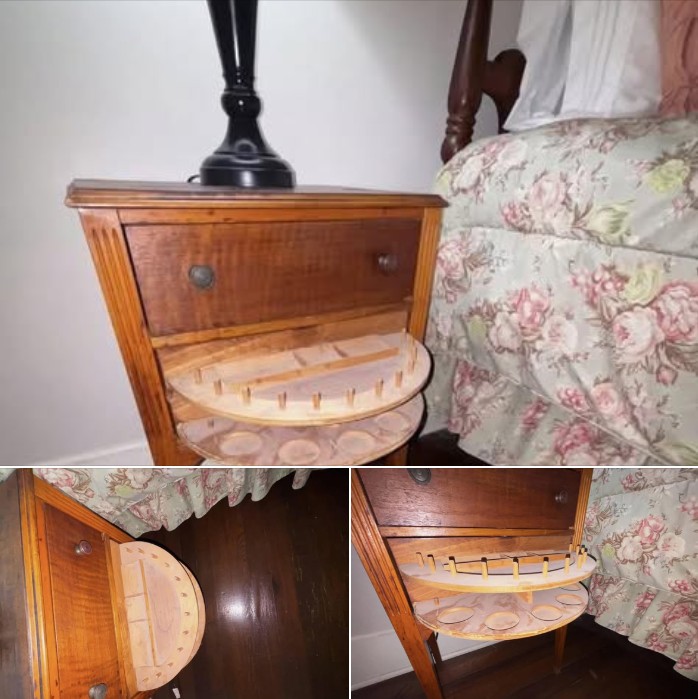 The cabinet’s lower drawer spins, revealing pegs and circular holes. At first glance, it seemed designed to hold sewing items — spools, bobbins, or needles — much like the cabinets used by early 20th-century seamstresses.