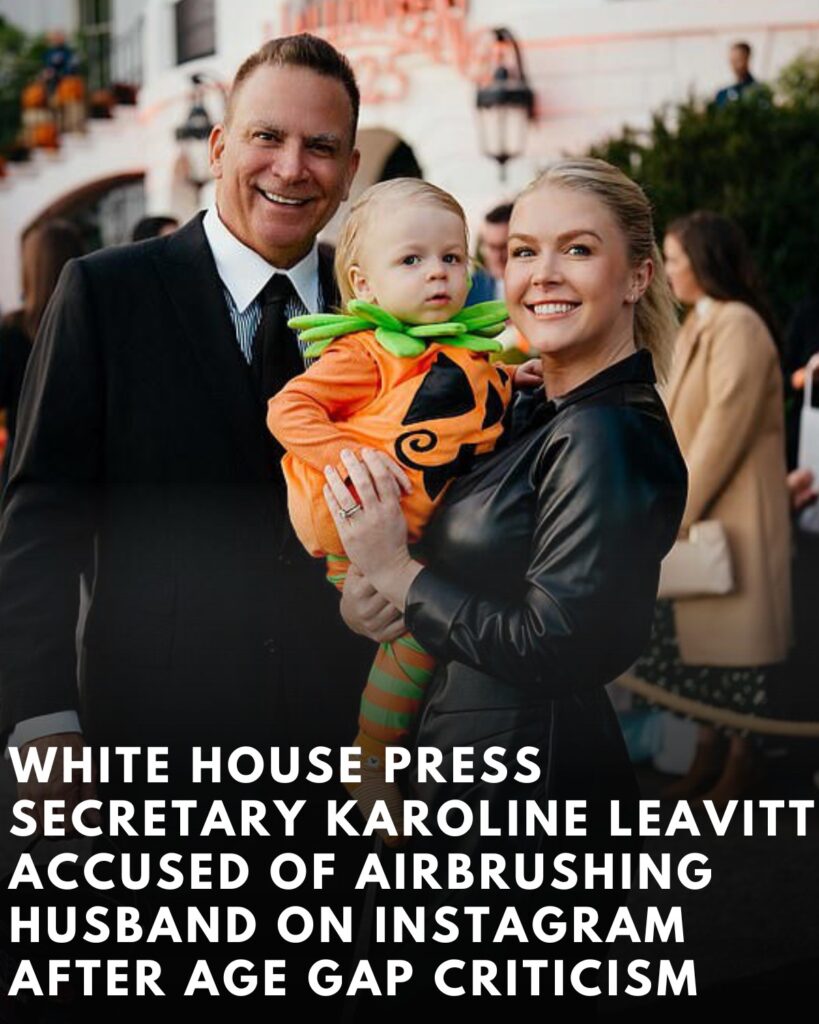 A Halloween family photo posted by White House press secretary Karoline Leavitt has prompted scrutiny over apparent image editing and reignited debate around the 32-year age gap between the 28-year-old press aide and her husband, 60-year-old New Hampshire real-estate developer Nicholas Riccio. The image, shared on Leavitt’s Instagram account and taken during the White House’s trick-or-treat event, shows Leavitt smiling alongside Riccio and their one-year-old son outside the executive mansion. Within hours, users began leaving comments alleging that Riccio’s face appeared smoothed or altered compared with the rest of the picture, a claim that quickly spread across social platforms and into political media coverage. “Old man hands blow your cover up Karoline. Your husband’s face does not match his hands,” one commenter wrote on Instagram, while another said, “The guy on the left seems to have only his face photoshopped,” reflecting a common refrain beneath the post.