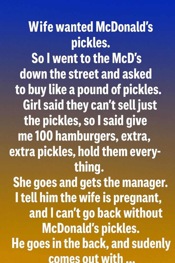 A moment later, the manager came out—a guy in his late thirties, the kind of person who looked like he had seen every possible type of customer and was hard to rattle. He asked what was going on, and I explained the situation in the simplest, most honest way possible: “My wife is pregnant, she’s having a serious craving, and she specifically wants McDonald’s pickles. I’m just trying not to go home empty-handed.”