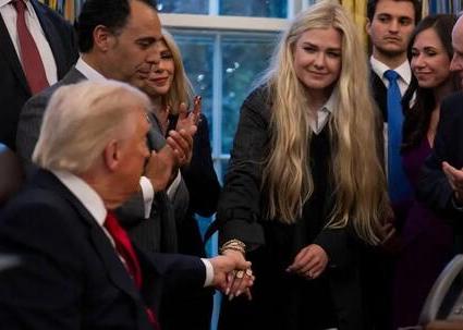 Erika Kirk, the widow of conservative activist Charlie Kirk and now the head of Turning Point USA, was at the White House to witness longtime family ally Sergio Gor take the oath as the new U.S. ambassador to India. As the group gathered for photos, Trump pulled Kirk in beside him, placing a hand on hers while leaning in for a cheek kiss. Cameras captured her leaning forward slightly, lips pursed in an awkward pose as the president made the gesture.